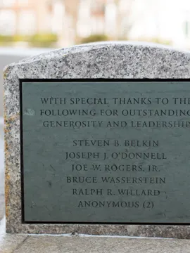 In recognition of this support the School created the Class of 1971 Courtyard behind Aldrich Hall. The commemorative architectural elements include a semi-circular wall inscribed with the words “Excellence, Integrity, Leadership” and lists the leadership donors Steven B. Belkin, Michael Porter, and Joseph J. O’Donnell.