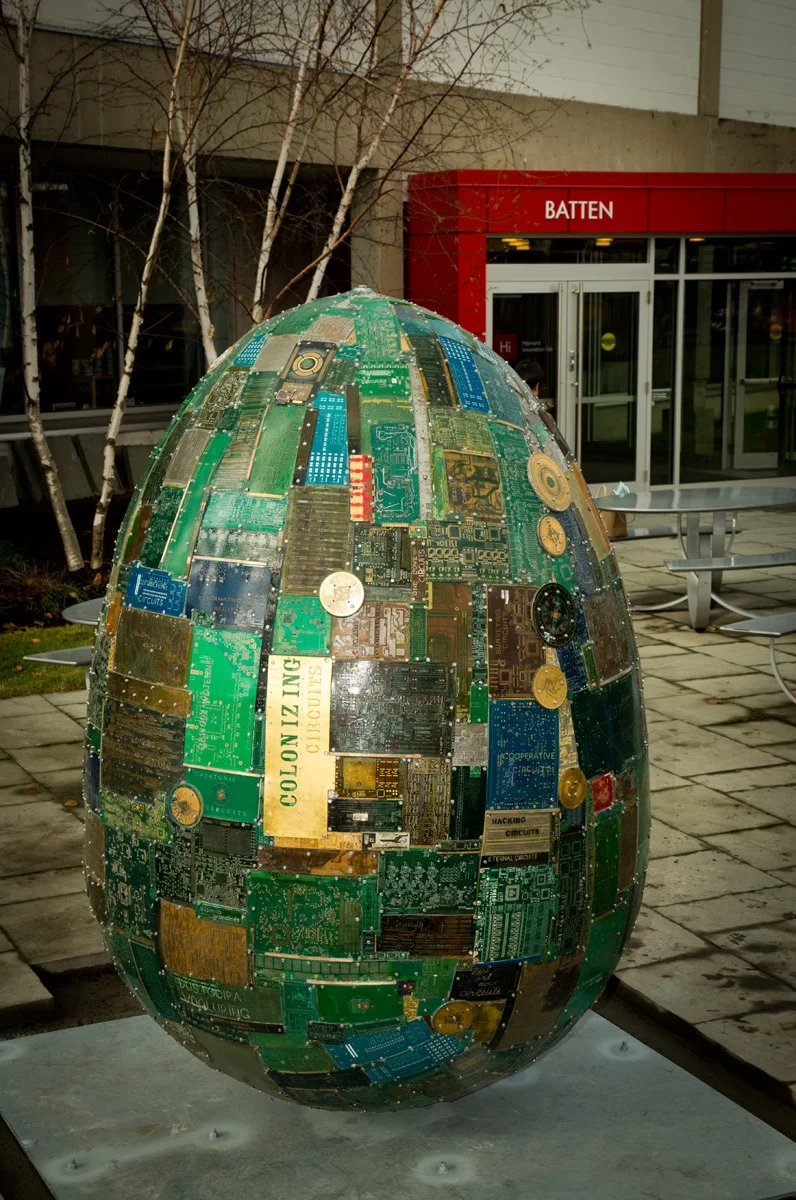 Digital DNA is a seven-foot-tall egg-shaped sculpture made of printed circuit boards on fiberglass and styrofoam by artists Adriana Varella and Nilton Maltz. Many of the boards are etched with phrases crowd-sourced from people of all walks of life, who shared with Varella their thoughts about technology as the “circuits in their lives." Phrases appear in a variety of languages, and they speak to a wide variety of ways in which technology and humanity intersect. Digital DNA was originally commissioned by the city of Palo Alto in the early 2000’s, and resided in Lytton Plaza in the center of the city. When the city decided to deaccession the work, an anonymous art collector stepped in to purchase it. The sculpture required extensive treatment by Varella to make it ready for its new home outside the Harvard Innovation Lab on Western Avenue in Allston. Situated directly between the Harvard Business School and the Harvard John A. Paulson School of Engineering and Applied Sciences, the iLab is a hub of innovation open to students and faculty across the University who are interested in entrepreneurship. Digital DNA was on loan to Harvard from 2018 through August 2023.