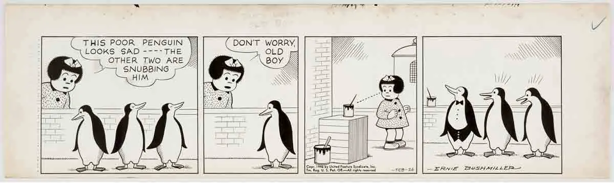 Ernest Paul "Ernie" Bushmiller, Jr. was a cartoonist best known for his comic strip Nancy, which premiered in 1938. It is one of the most popular, widely syndicated, and longest running comic strips. As Paul Karasik and Mark Newgarden noted in their 2017 book, How to Read Nancy: “Ernie Bushmiller had the hand of an architect, the mind of a silent film comedian, and the soul of an accountant. His formulaic approach to humor beautifully revealed the essence of what a perfect gag is all about–balance, symmetry, economy.”