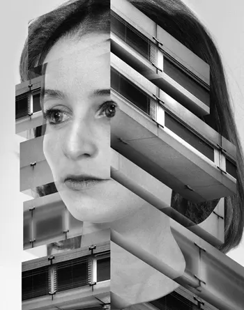 In this work, Valie Export digitally manipulates and merges original photographs of nurses and hospital architecture. The women and their work environments form one image, as glass windows meet skin and the curve of an eye transforms into molding. In 2007, critic Eleanor Heartney described this series in Art in America as “the human getting subsumed into heartless corporate architecture, or... emblems of modernist impersonality assuming human characteristics.”