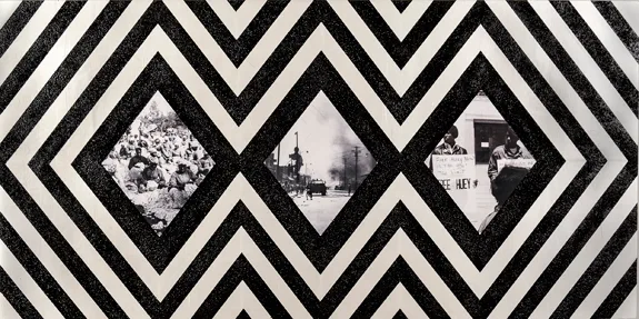 Born in Augusta, Georgia, Rico Gatson received his Bachelor of Fine Arts degree from Bethel College in 1989 and his Master of Fine Arts degree from Yale School of Art in 1991. In Untitled (Three Diamonds), Gatson uses diamond shapes to frame three historical images: a group of women picking cotton, a street view of buildings burning in Watts, Los Angeles, in 1965, and members of the Black Panthers protesting in the late 1960s. In the artist’s words, “The textured diamond pattern reverberates from the center of the painting to the edge portraying the journey of experience from enslavement and rebellion to protest and beyond.” Gatson uses such bold radiating patterns and shapes to draw the viewer into the work. As he has stated, “I’m always interested in seducing the viewer and then hitting them on the way out, allowing a delayed response to powerfully charged content.”