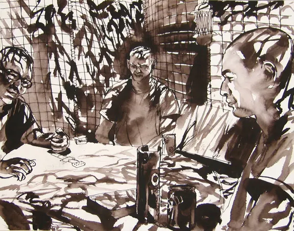 Steve Mumford (American, born 1961), Spc. Gregory Booth and Pfc. Abraham Thomas Riley of 1st Platoon, Alpha Co. playing dominoes, at bridges installation near Baquba, July, 2004, 2004, ink and watercolor on paper, 12 x 16 in. Schwartz Art Collection, Harvard Business School, 2005.14.