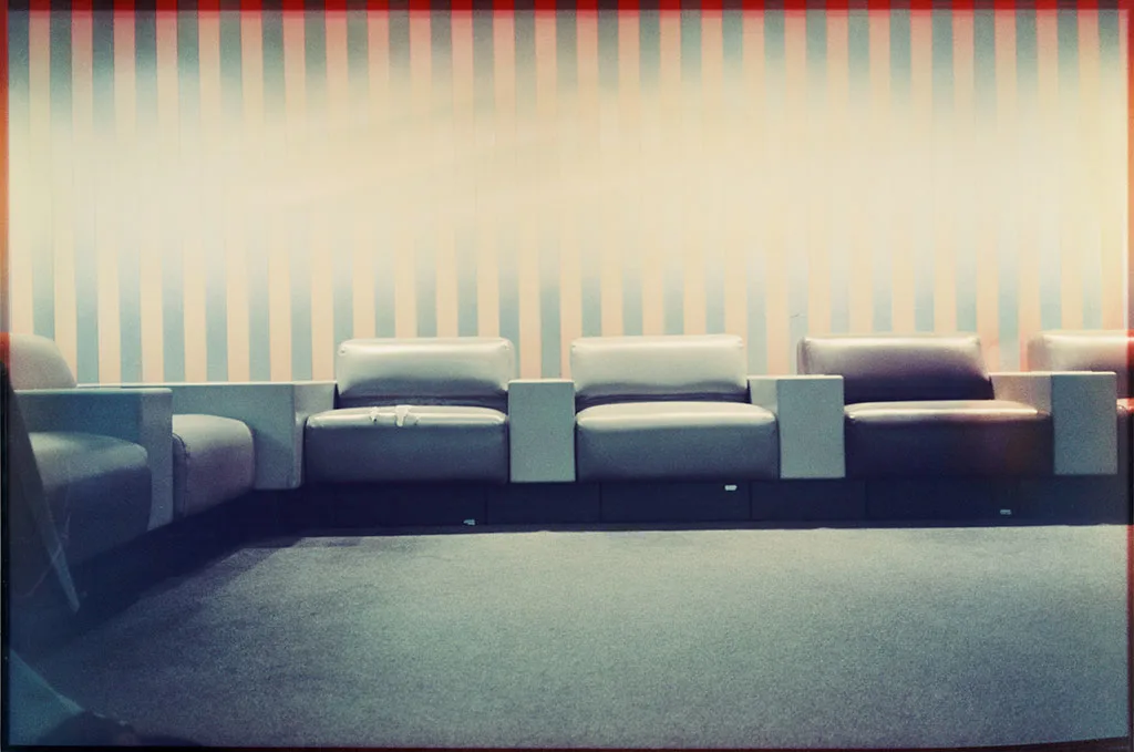This photograph is part of a series that Martha Rosler began in 1983, which explore the interior architecture of airports. Rosler described the series and how it has evolved in a 2017 interview with Anne Doran in ARTNews: “I’ve never gone to an airport to take a picture. I take photos when I’m traveling, usually when I’m pushing a cart or dragging heaving luggage, and just before I get on a plane or just after getting off—all typically late at night, because I prefer to travel at off hours. I’m interested in delineating the physical space that a traveler inhabits….I saw how the airport terminal was constructed to convey something visually about where we were and where we were going. We were not, experientially at least, somewhere fixed—we were ‘en route,’ walking corridors with big light-box displays extolling the virtues of somewhere else. There was an effort to calm people, to pacify them, and to persuade them that all the disaccomodation they’d experienced was worth it, through spectacular images of other places.”